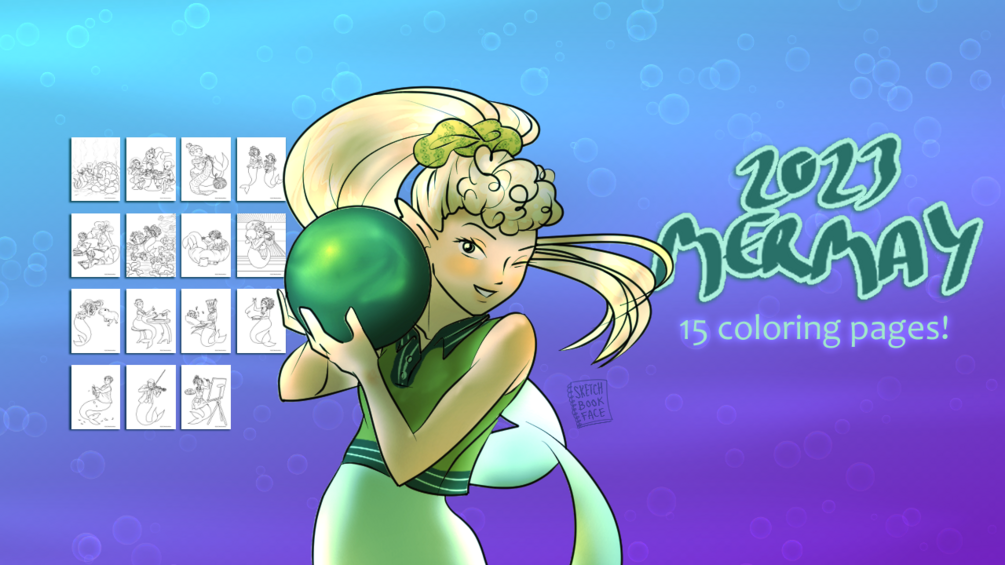 Dive into some coloring fun with this set of 15 pages of line art from my 2023 MerMay pieces!